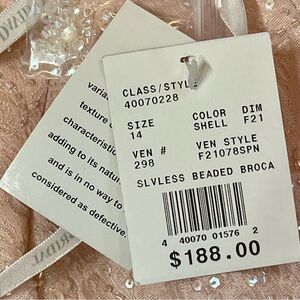 David’s Bridal Sequined Brocade Bodice Mock Two Piece Shell Pink Dress NWT Sz 14