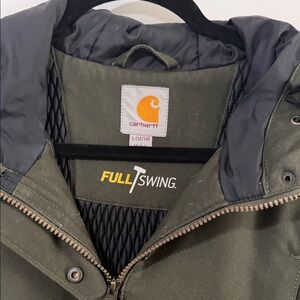 Olive Carhartt jacket with hood. Features zip and button closure. Full Swing Jacket