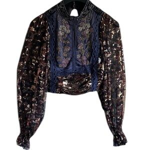 This stunning blouse from Free People features a unique beautifully embellished high neck bib bodice offering a chic and sophisticated look. The fitted cropped design with sheer blouson sleeves accentuates your silhouette and gives a touch of romance while the blend of black and brown with gold metallic “chips” adds a touch of elegance. Perfect for making a statement at any event!
