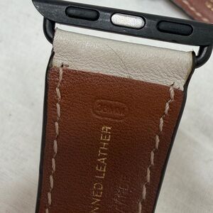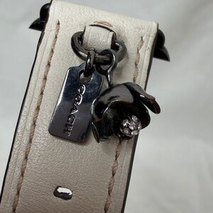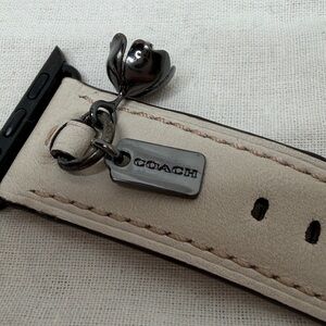 For sale is a Coach brand white leather Apple Watch strap with gunmetal tone charms and hardware. For a 36MM size Apple Watch. Please examine photos for detail and feel free to ask any questions. From a smoke-free, non-shedding dog home.