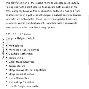 This playful edition of the classic Pochette Accessoires is joyfully reimagined with a multicolored Monogram motif as part of the cross-category Louis Vuitton x Murakami collection. Crafted from coated canvas in a petite pouch shape, a natural cowhide-leather trim adds an emblematic House touch, while golden hardware introduces a chic polished accent. Complete with a removable strap and chain for versatile styling options.