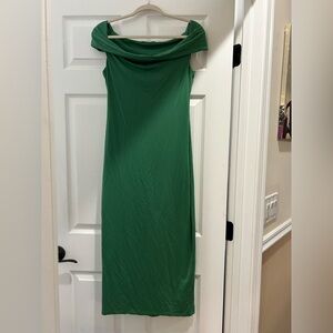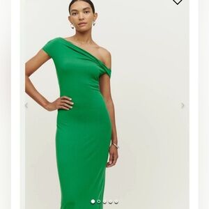 Chic green long dress by Reformation. Features a sleek silhouette. Perfect for versatile styling.