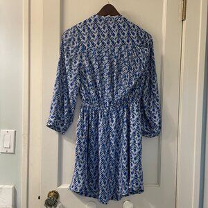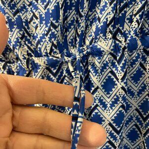 This is a Maeve Galen Dress for Anthropologie, which features a blue and white geometric print and 3/4 length sleeves. It has a draped v-neckline and an elasticated or gathered waist.