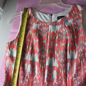 Cute sleeveless fit and flare. Bright coral, white, green and blue abstract boho pattern. Rear zip. Some stretch.