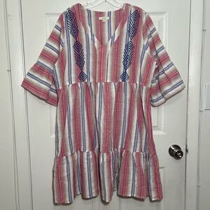 Brand new without tags. Has pockets. V-neck dress with multicolor stripes and geometric embroidered pattern. Features pink, blue, white, and tan colors. 65% polyester 35% rayon.