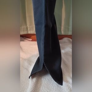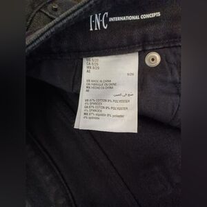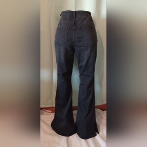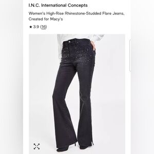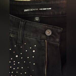 Womens high rise rhinestone studded flare jeans. Created for Macy's. Slit sides at ankles. Stylish black jeans with elegant embellishments. Perfect for a chic and modern look. New with tag. There is a light fade line in front rhinestone area. see pictures. they are part of the description. measurements are approximate.