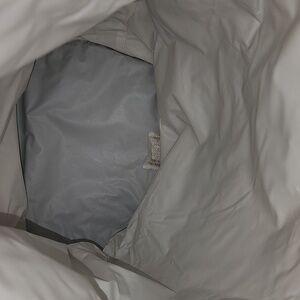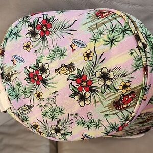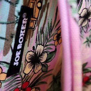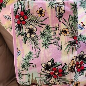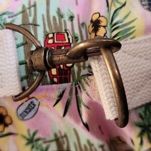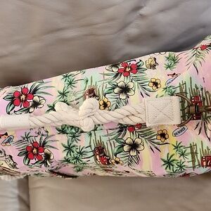 Pink beach themed canvas bucket tote bag, backpack. Rope strap adjusts and is detachable at bottom. Outer zip closure pocket.Inner polyurethane lining. Attached matching small lined pouch. This can be a tote or backpack.