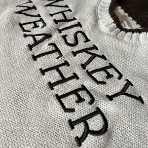 Moon & Madison cream colored and embroidered “Whiskey Weather” sweater. Tag size is a women’s small, please see photos for measurements. Has a few minor flaws/snags also shown in photos. Still in good condition.