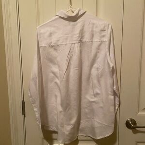Classic white button-up shirt with front pockets. Features a collared neckline and button details.