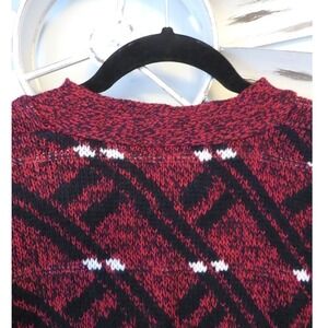 Vintage Sostanza Fashion Police Cardigan Sweater Burgundy Black Geometric 80s 90s. Size Medium. Material is 100% Acrylic. Machine Wash, Tumble Dry.