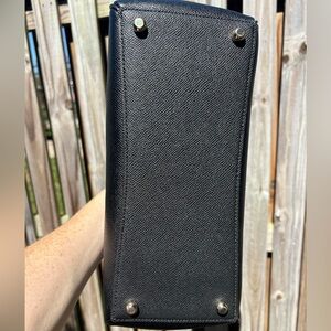 Interior: black fabric lining, excellent condition. Main compartment features a snap top closure and two side zip compartments.