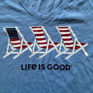 LIFE IS GOOD soft Blue tee with American flag chair design. The Tee has short sleeves and a V-neck. Perfect for everyday wear.