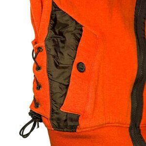 Sean John hooded sherpa-lined vest in a bold orange and brown colorway. This versatile layering piece features a cozy fleece-lined hood, full front zipper, snap-front pockets, and unique lace-up side details for an adjustable fit. A great streetwear or cold-weather layering essential.