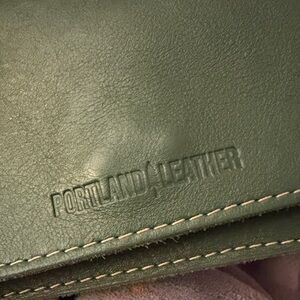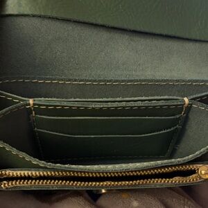 Elegant green leather wristlet clutch. Features a secure strap and sleek design. Perfect for any occasion.
