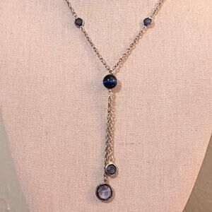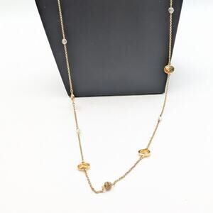 Long Gold Tone Chain W/ Faceted Gold Bezel Set Crystal Station 48" Necklace. Pre-owned, this necklace is in great condition with only minimal wear. Comes with polishing cloth.
