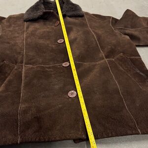 Elegant brown suede jacket by Steve & Searle. Features a luxurious faux fur collar. Real leather patchwork.