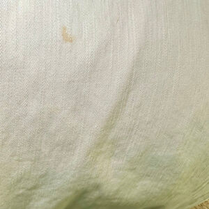 These are a pair of women's white cropped pants by Jessica Simpson, size 8, made in Cambodia. They feature a button and zipper closure, with two large patch pockets on the front and two on the back. The fabric composition is 98% cotton and 2% spandex. Visible imperfections include a small brown stain on the lower left leg and a greenish discoloration on the lower right leg, both on the back. The pants have a wide-leg, ankle-length cut. Also light green stain at waistband.