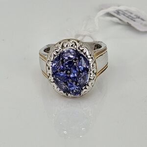 Gorgeous sparkling natural tanzanite in a cluster in an oval shape. The setting is crafted of palladium alloy, sterling silver and 18k yellow gold framing. The approximate carat weight is 4.40 carats of earth-mined tanzanites in a highly saturated color of blue consistent with the higher grade of tanzanite. This ring is new with tags. Stamped by designer hallmark and 925. Size 7!