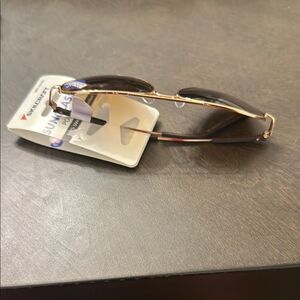 These aviator sunglasses feature a sleek gold metal frame and brown-tinted lenses, offering a timeless and sophisticated look. The classic double bridge design and thin temple arms ensure a comfortable fit, making them a stylish accessory for any occasion.