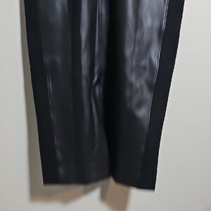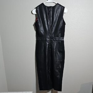 Chic black midi dress with leather front. Sleeveless design. Perfect for stylish outings.