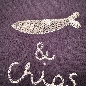 Boden navy blue crew neck sweater, fish and chips, size small. Beautiful detailing.
