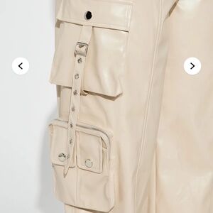 Pants only. Faux Leather Pant. Wide Leg Pant. Button And Zipper Closure. Cargo Pockets. Back Pockets. Ankle Ties. 32.5" Inseam. Self / Lining 100% Polyester.