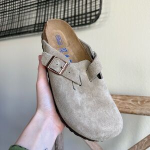 Signature suede slip-on clog from Birkenstock featuring an adjustable buckle design and a comfortable cork footbed.