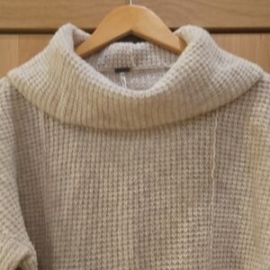 amazingly soft neutral waffle cowl neck sweater. Soft knit texture. Ideal for layering, medium, good condition but there is a small area under the neck that needs to be restitched, super comfy neutral vibe, cuffed sleeve, a standout sweater from free people!
