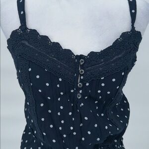 Hollister navy blue polka dot cami top with lace trim and button front, size medium.
