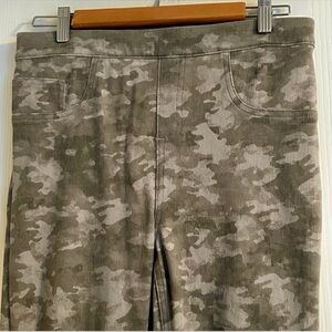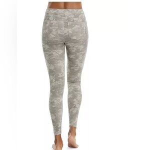 SPANX Stone Washed camo print jean-ish leggings in a gray-green colorway, size L/G. Made from a comfortable cotton-blend fabric with elastane for stretch, these pull-on leggings offer a smooth, flattering fit with the look of denim. Designed with functional back pockets and SPANX’s signature shaping comfort.