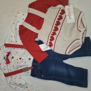 Cute baby outfit set with heart prints. Includes a white shirt with red hearts, red bow tie, and suspenders w blue jeans and a cream romper with red hearts.