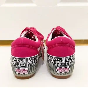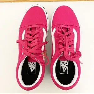 Bold pink platform shoes. Classic Vans style. White accents with checkered detail. Perfect for a standout look.