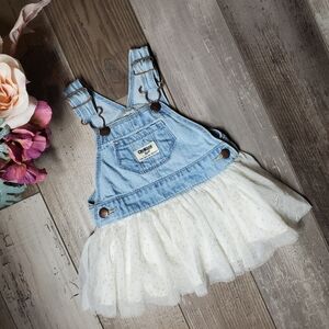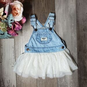OshKosh B'gosh baby girls dress. Denim overalls top with the sweetest sparkly polka dot tulle skirt. So fun and perfect for spring and summer! The tulle overlay has gold glitter polka dots that adds a whimsical feel to this piece. It is size 6 months. In excellent condition.