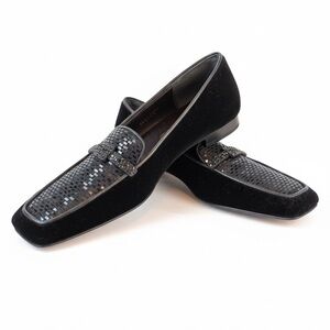 Sophisticated black velvet loafers with shimmering sequins. Ideal for formal events. Stylish and elegant design.