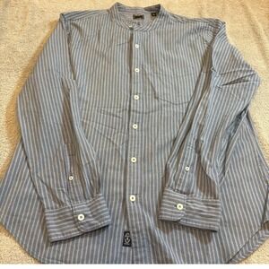 Todd Snyder blue stripe band collar button-up shirt. This men's XL shirt features a classic stripe pattern and a band collar for a modern, refined look. Two chest pockets add functionality and a touch of utility. Perfect for casual outings or smart-casual office wear.