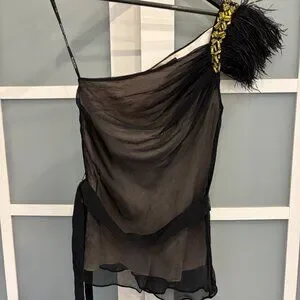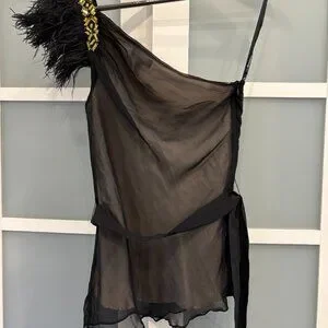 Elegant sheer top with feather detail. Features gold embellishments. Perfect for evening wear.