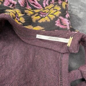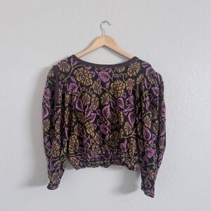 Free People women's floral embroidered balloon sleeve keyhole top, size large. Features rich jewel-toned embroidery in purple, mustard, and black, 100% cotton fabric, and a cropped fit. Can be worn both ways (forward or backward) for versatile styling. Slight snag on embroidery (see photos), otherwise in excellent condition.