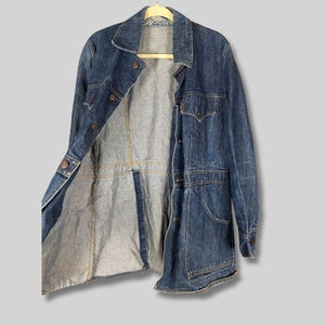 This vintage Levi’s chore coat features a classic medium wash denim with a longer length and utilitarian silhouette. Designed with button-flap chest pockets, deep hand pockets, and a button front, it blends timeless workwear with everyday style.
