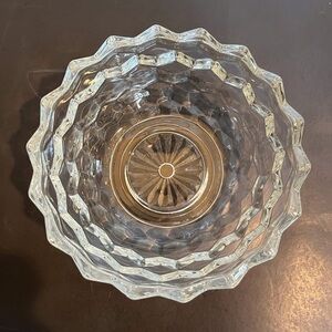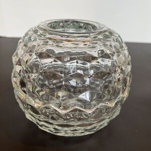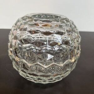 Vintage from the 1970s. Two pieces of clear glass with a cube pattern. The two pieces fit together by the sawtooth edges. Place candle in bottom glass and watch the beautiful light patterns. H 5in x W 5in. Excellent condition.