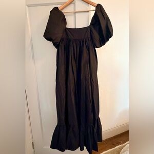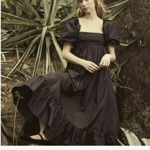 Elegant black midi dress by Doen. Features a square neckline and ruffled hem. Perfect for any occasion. Silk. Work only a few times. Perfect condition!