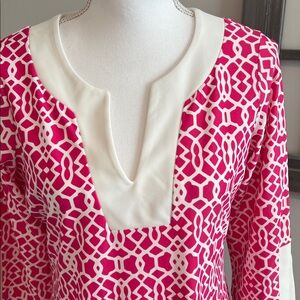 Jude Connally dress, geometric print, pink tunic dress, resort wear, preppy chic, travel dress, wrinkle-free, summer dress, coastal style, brunch outfit, 3/4 sleeve dress, nylon spandex