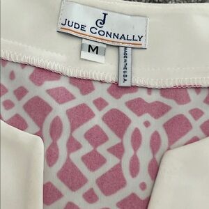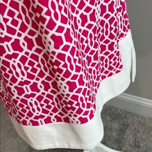 Brighten your wardrobe with this classic Jude Connally tunic dress! Featuring a bold pink and white geometric print with crisp white trim at the neckline, cuffs, and hem, this easy-care dress combines comfort and timeless resort style. Crafted in Jude Connally’s signature nylon-spandex fabric, it offers a flattering fit that moves with you and resists wrinkles — perfect for travel, brunch, or coastal getaways.