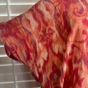 Stylish Chico's dress with vibrant red and pink patterns. Features a relaxed fit and short sleeves.