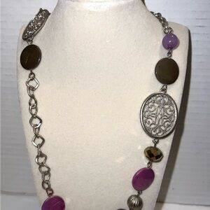 This elegant necklace features intricate silver detailing and vibrant purple accents, perfect for adding a touch of sophistication to any outfit. Pre-owned