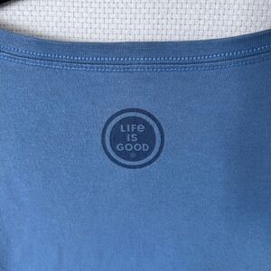 Life Is Good womens long sleeve crusher tee in a vibrant blue hue featuring a beautiful floral graphic and the brand's signature positive messaging. This comfortable and stylish t-shirt is perfect for casual outings, weekend adventures, or lounging at home.