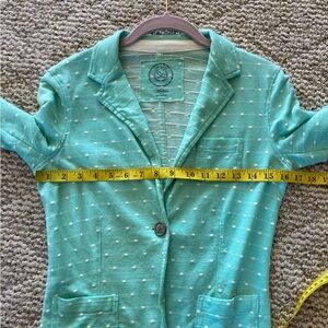 SO casual mint green with white and polka dot pattern blazer cut jacket with a very casual, sweatshirt like feel and a single button. Some pilling visible close up. Size Medium, likely juniors