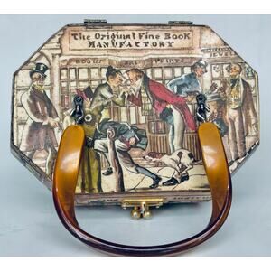 Vintage 1970's wood storage box purse with acrylic handle and metal clasp. Decoupage Victorian book seller theme. Trinket box, catchall, storage, bookshelf styling. Approx measurements: 8 in long, 5.5 in tall, 5.5 in wide. Excellent vintage condition, slight stain on interior. See photo of green interior.