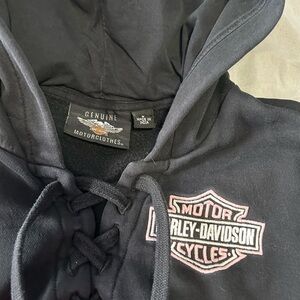 Women’s Harley Davidson, black hoodie with pink logos, and crisscross tie in the front. Worn a handful of times in excellent condition.