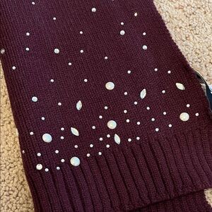 Stylish burgundy scarf featuring white speckles. Perfect for adding a touch of elegance to any outfit.
