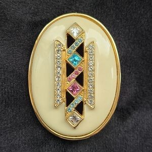 Vintage brooch with gorgeous art deco type design. Beautiful gem detail. In great shape! Showing little to no wear. Will be shipped with care.
